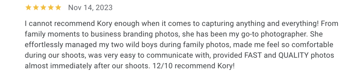 I always send a sneak peek within 24 hours of our session of about 10-15 images. After that my turnaround time varies between about 2-3 weeks. If it is a busy season it may be longer but I will always communicate that with you at the end of our session.